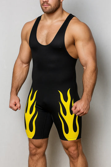 Wrestling Tights Black, Yellow Fire Style, Stretchable and Customized Colors