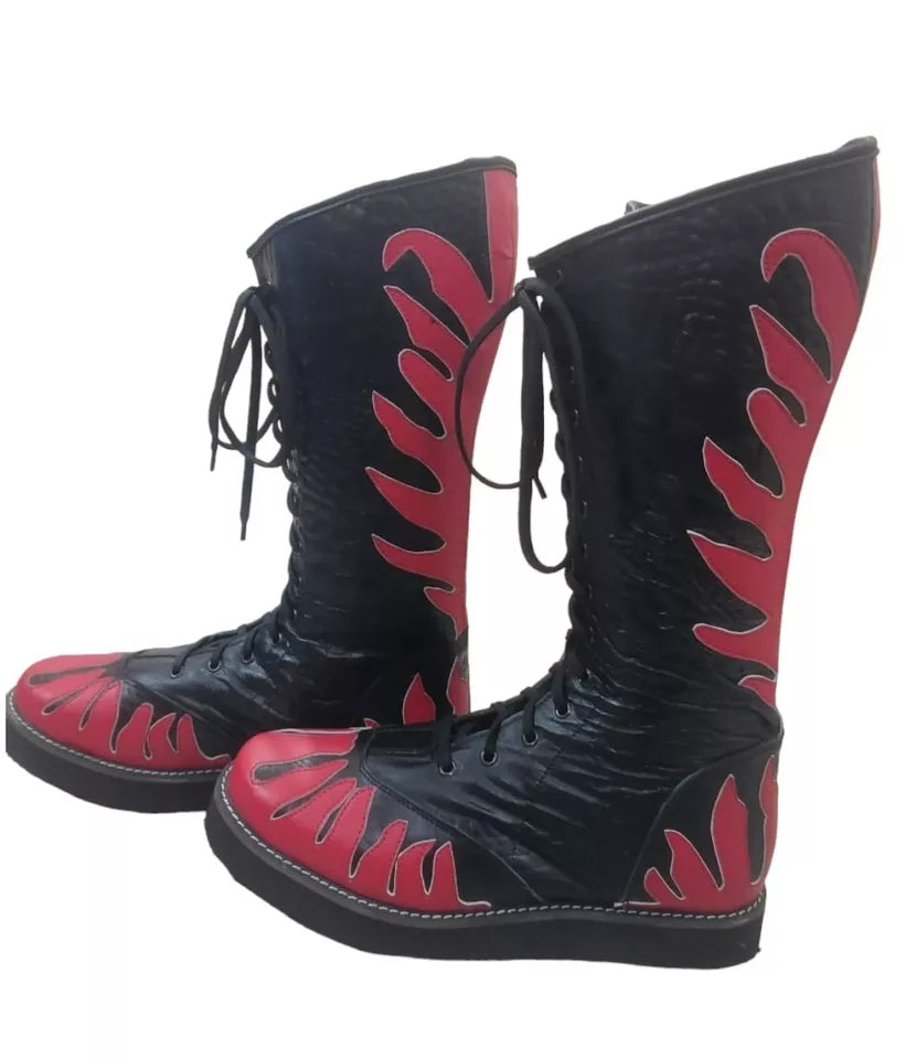 Stap die kryt in met selfvertroue en styl met ons Handgemaakte Leer Stoeistewels. Gemaak met 100% egte leer, spog hierdie stewels nie net met ongeëwenaarde duursaamheid nie, maar ook met 'n unieke en luukse estetika. Die treffende ROOI kleur word beklemtoon deur 'n vuurstyl-leerlaag, wat 'n ekstra dimensie aan jou stoeiklere gee.