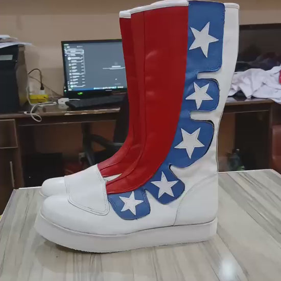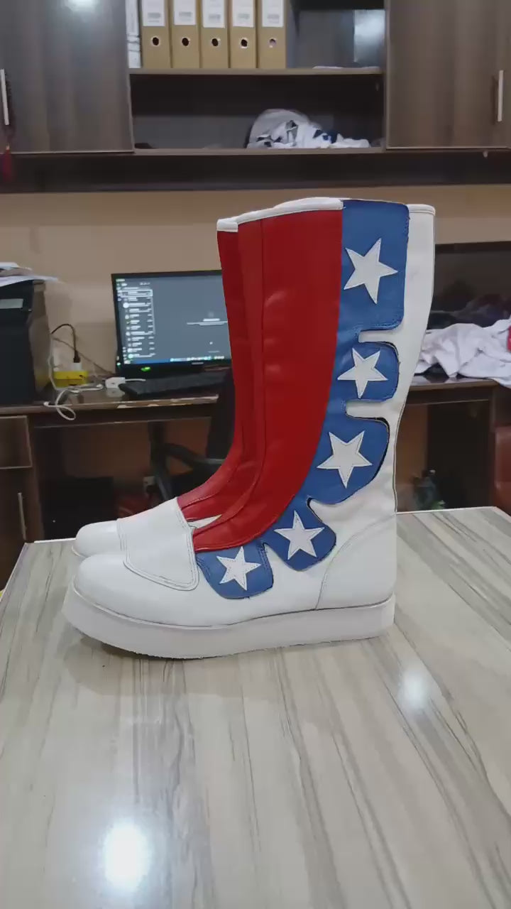 Pro Wrestling Boots, Handmade, 100% Original Leather, Hook and Loop style, white, red and blue with stars Customizable