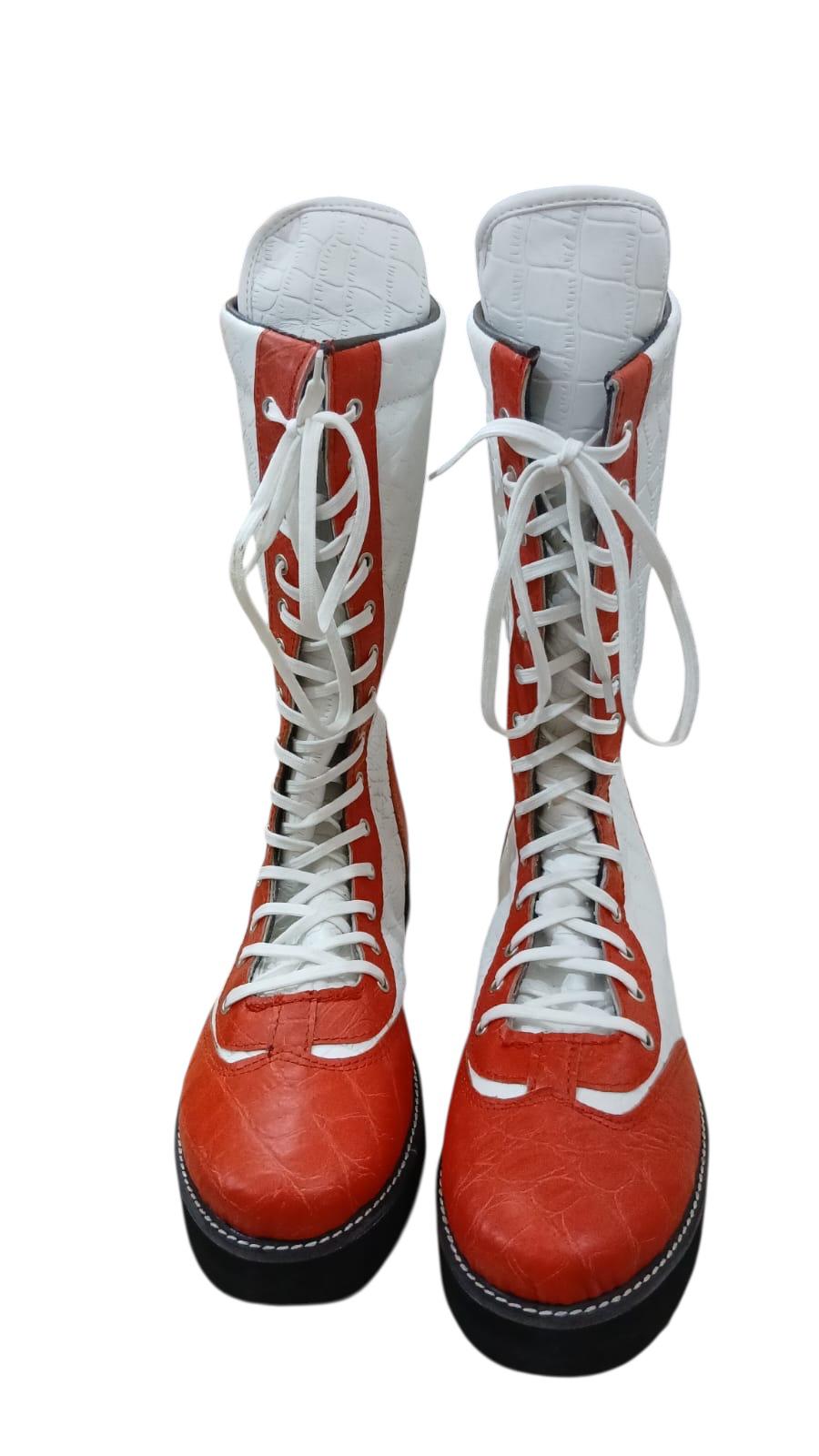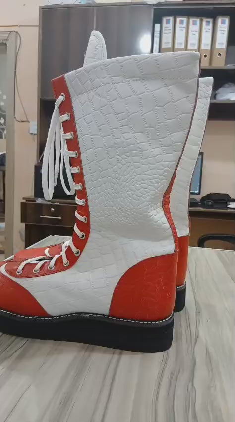 Pro Wrestling Boots, Handmade, 100% Original Leather, White & red Crocs Pattern, Customizable