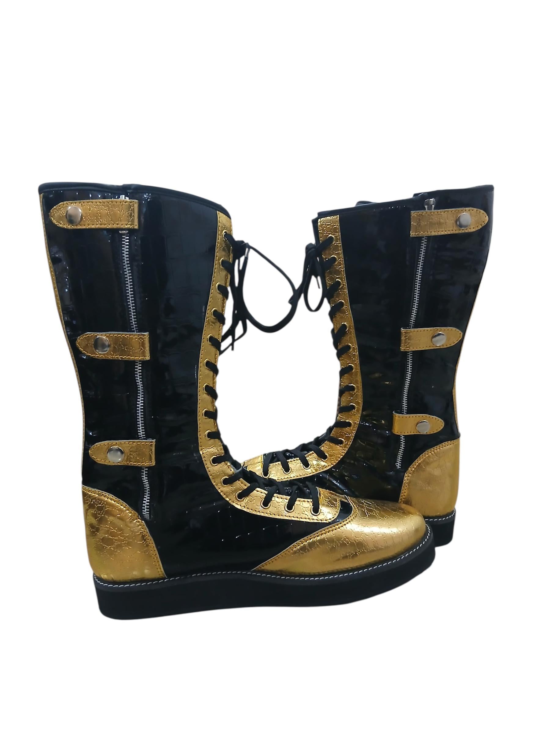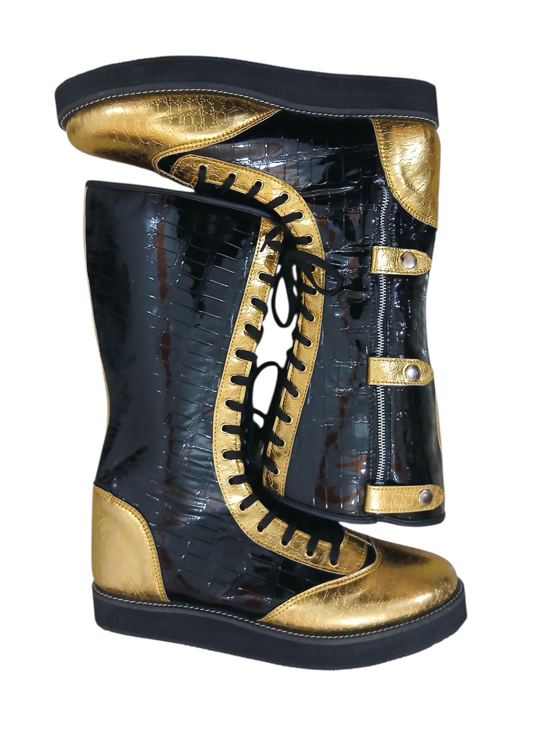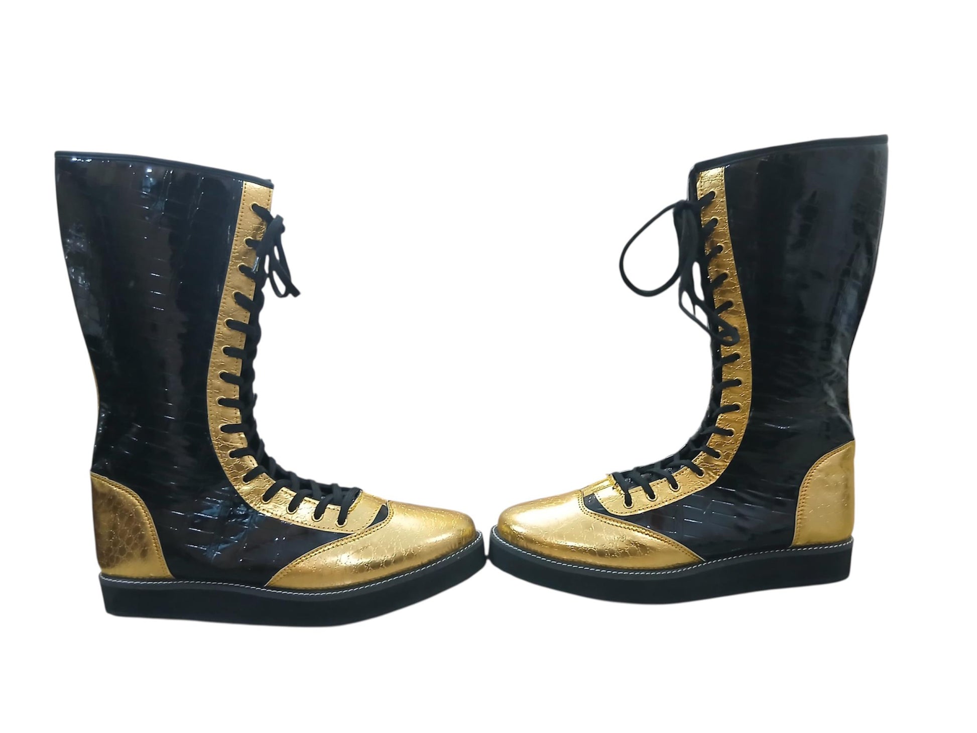 Pro Wrestling Boots, Handmade, DX Leather, Gold and black Crocs Pattern, with zipper