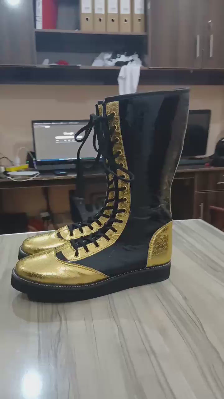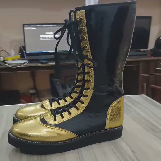 Step into the ring with confidence and style wearing our Handmade DX Leather Wrestling Boots. Crafted with DX leather, these boots boast not only unparalleled durability but also a unique and luxurious aesthetic. The striking Gold color is accentuated by a GOLD leather layer, adding an extra dimension to your wrestling attire.