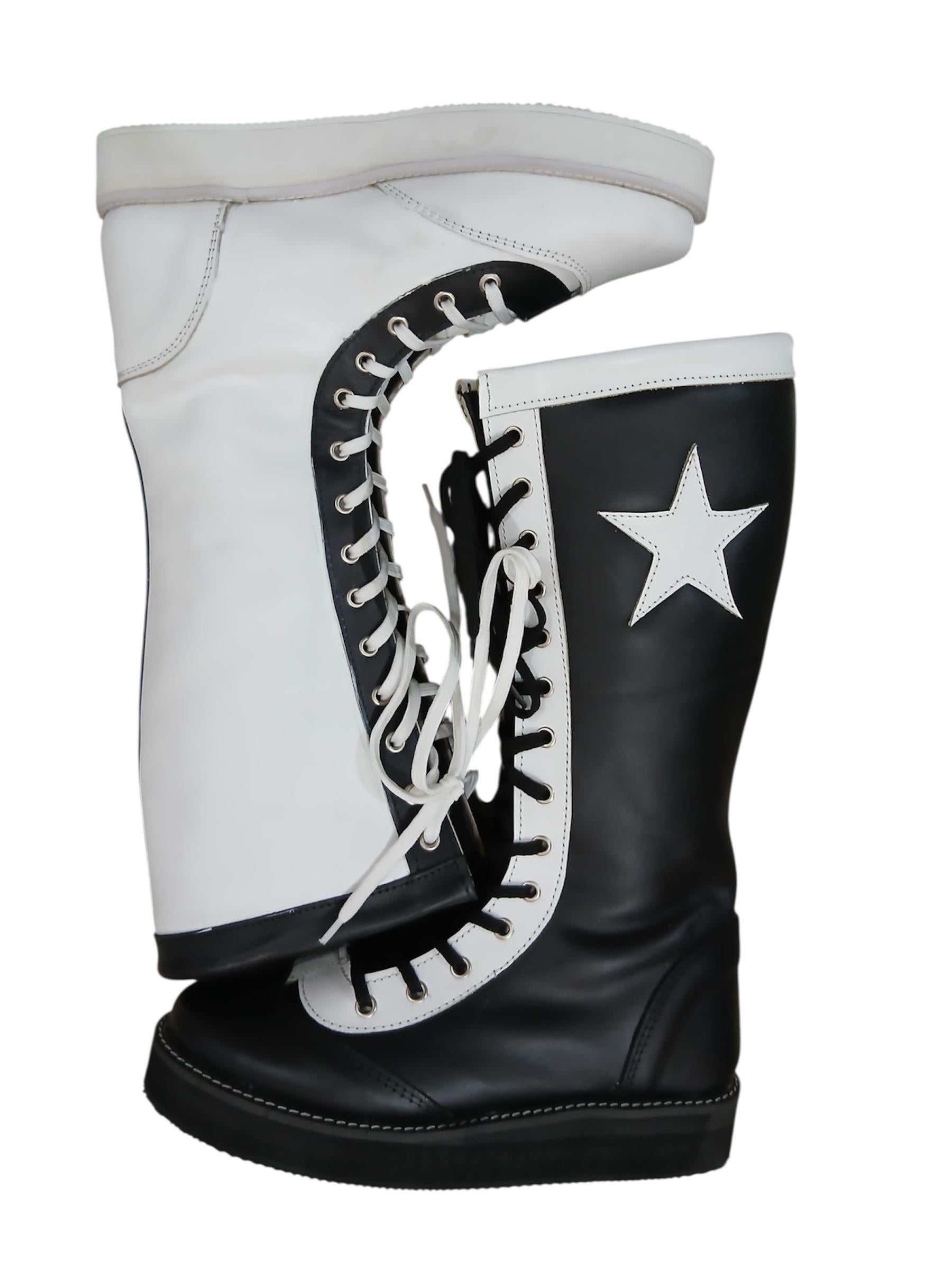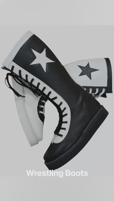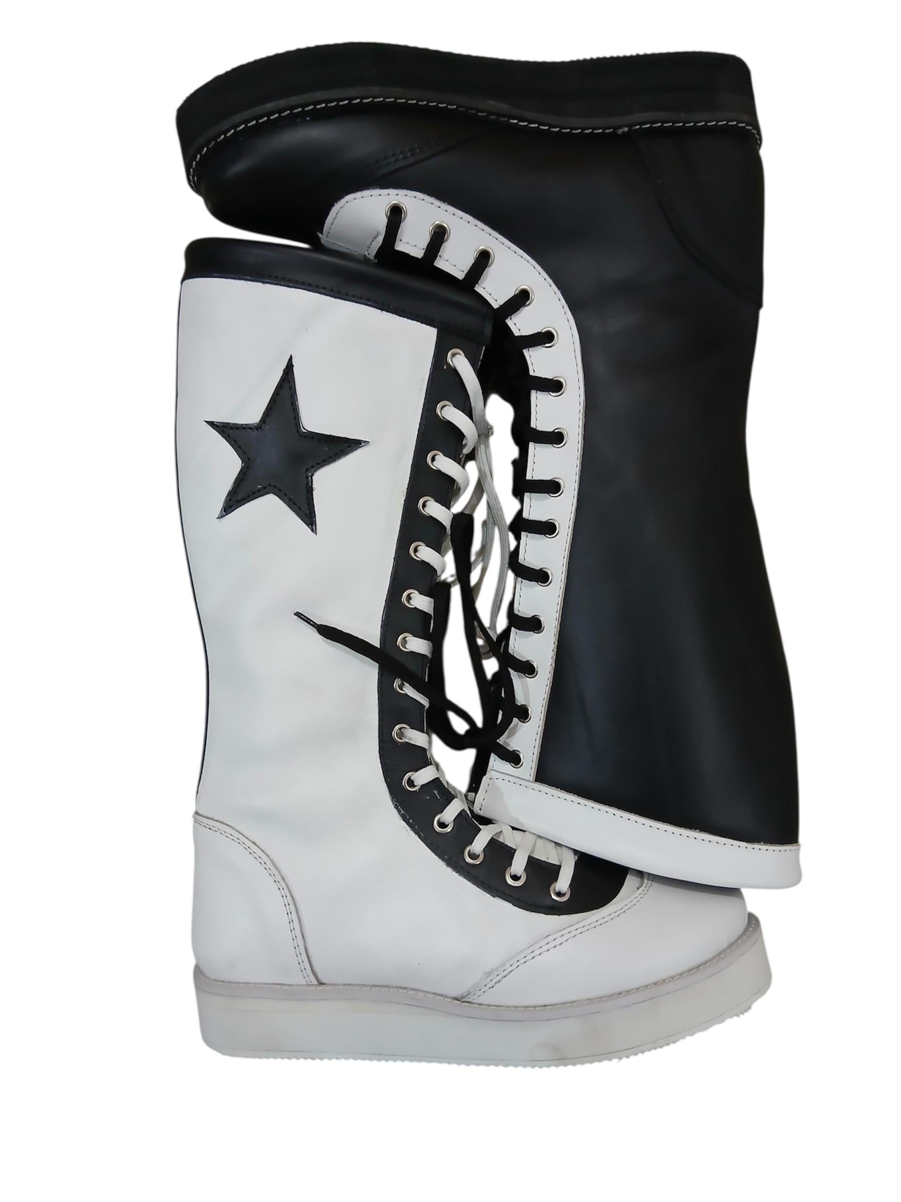 Step into the ring with confidence and style wearing our handmade pro wrestling boots. Crafted meticulously from 100% original leather, these boots offer durability and flexibility for your every move. The lace-up style ensures a secure fit, while the striking combination of White Leather and Black Leather, Star adds a touch of flair to your wrestling ensemble.